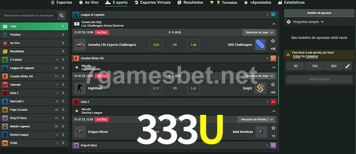 O 333U oferece uma grande seleção de opções de apostas em e-sports com probabilidades competitivas
